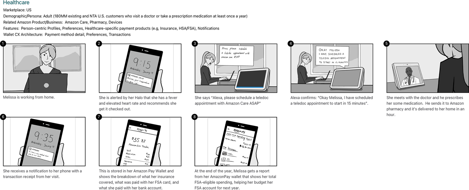 Storyboards I drew of the 2025 vision and how the wallet would blend into every day life.