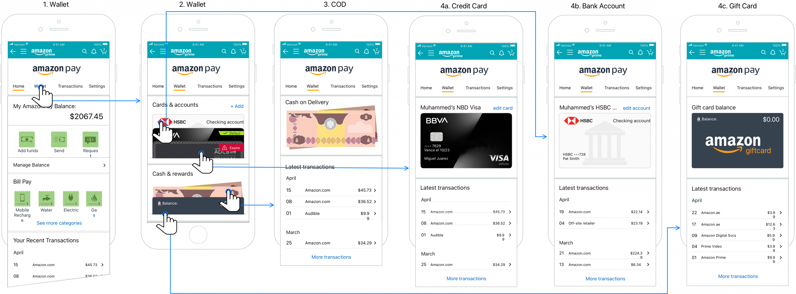 So we pivoted to UAE, and then Mexico, where we tested everything from a simplified, card-art-style wallet flow, adding a new card, mobile recharge (topping up cell phone minutes) and a branded checkout flow with “Amazon Pay”
